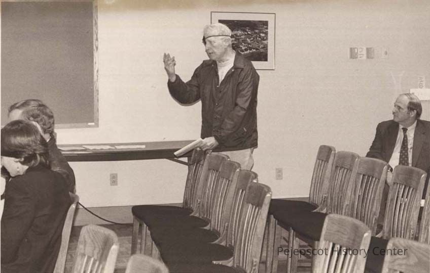 A B/W photographic view of a man with an eye patch speaking. This photo was published 10/7/1992.