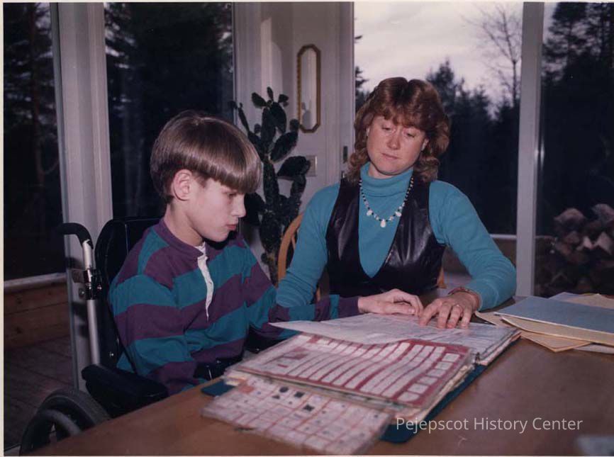 A photo view of a mother and child working at a table. 12/3/1990.
