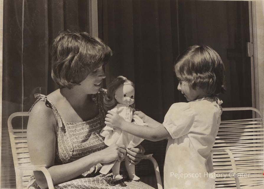 A B/W photographic view of a mother & daughter playing with dolls. This photo was published 7/11/1978.