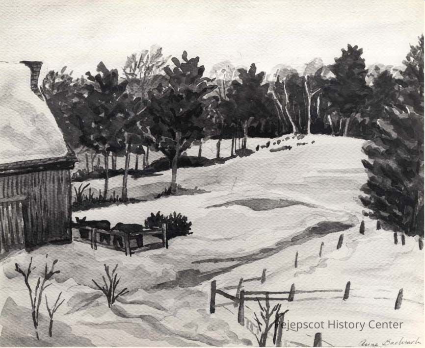A B/W photographic view of a pastoral scene painting by Anne Bachrach. This photo was published 7/6/1982.