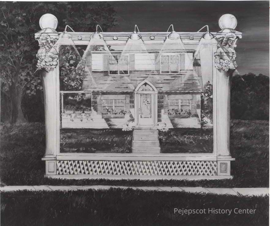 A B/W photographic view of a painting by Marjorie Moore. "The House on Spring Street", oil on masonite. This photo was published 6/5/1981.