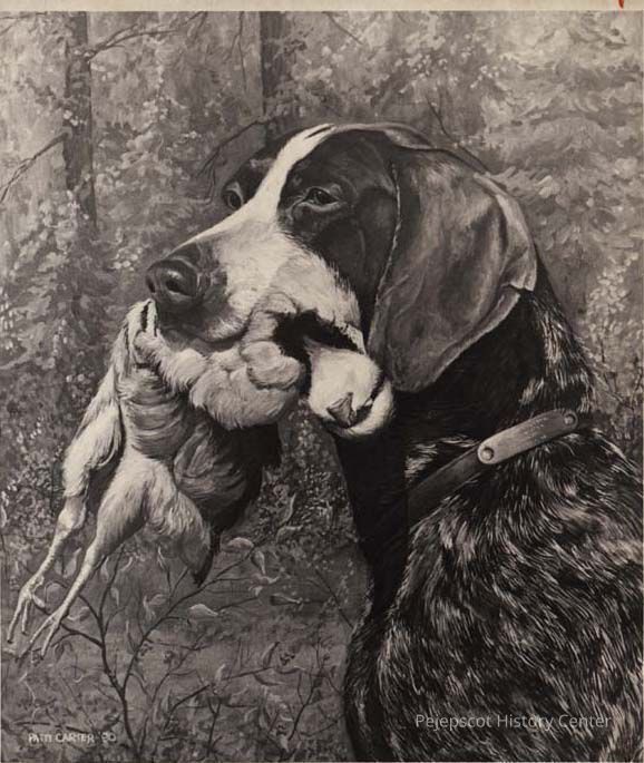 A B/W photographic view of a painting of a hunting dog done by Patti Carter. This photo was published 1/19/1981.