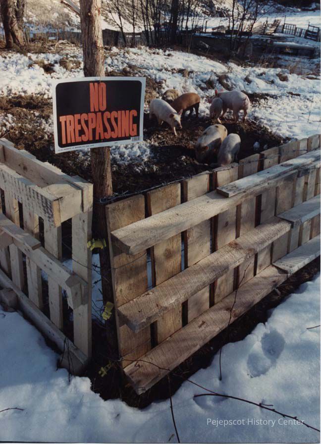 A color photographic view of a pig sty with a no trespassing sign on it.. This photo was published 11/30/1989.
