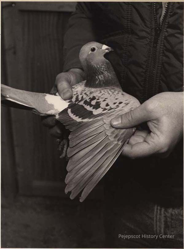 A photo view of a pigeon being held. 11/30/1992.
