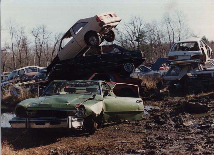 A photo view of a pile of cars in a junk yard. 1/15/1990.