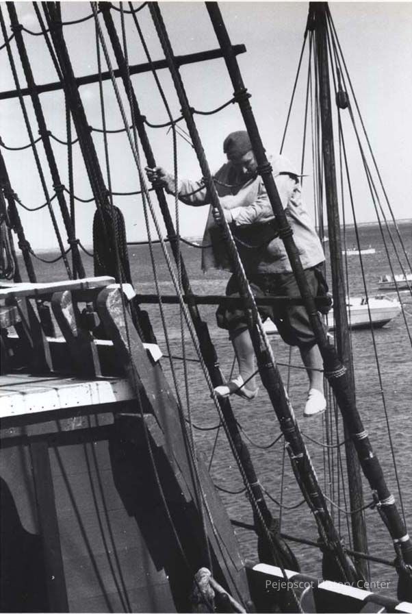 A B/W photographic view of a pirate climbing in a ship's rigging. This photo was published 11/11/1992.