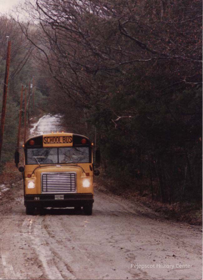 A photo view of a school bus on a gravel road. 5/12/1989.