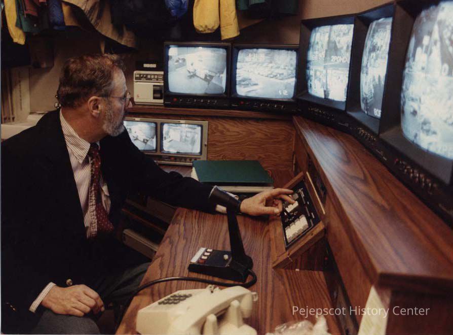 A color photographic view of a security guard watching monitors. This photo was published 4/12/1990.