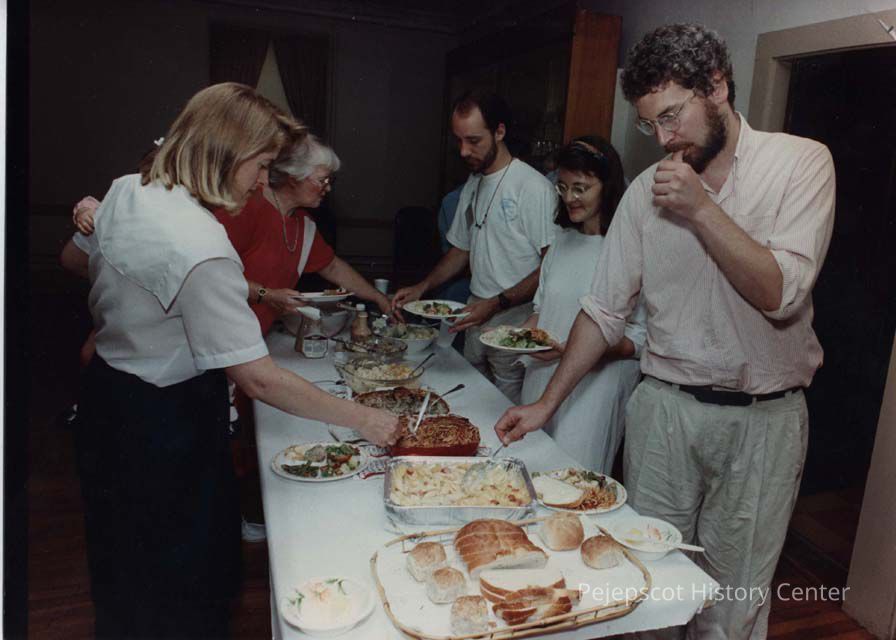 A photo view of a serving line at a pot luck supper. 8/11/1989.