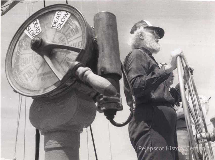 A B/W photographic view of a ship captain steering the ship. This photo was published 5/29/1992.