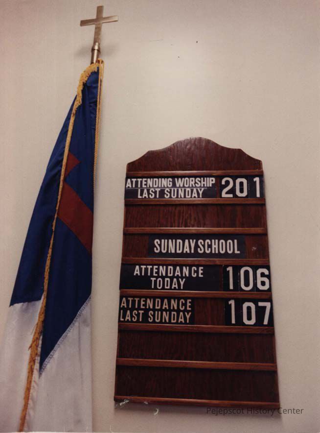 A color photographic view of a sign at the Maine Street Baptist Church. This photo was published 6/30/1989.