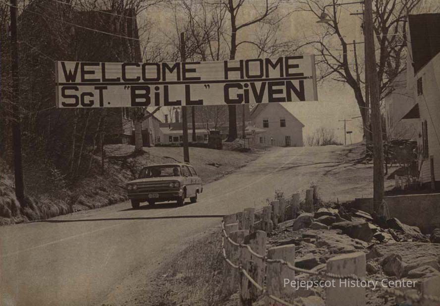 A B/W photographic view of a sign in Harpswell. It welcomes Sergeant William Given home from Vietnam. This photo was published 4/26/1968.
