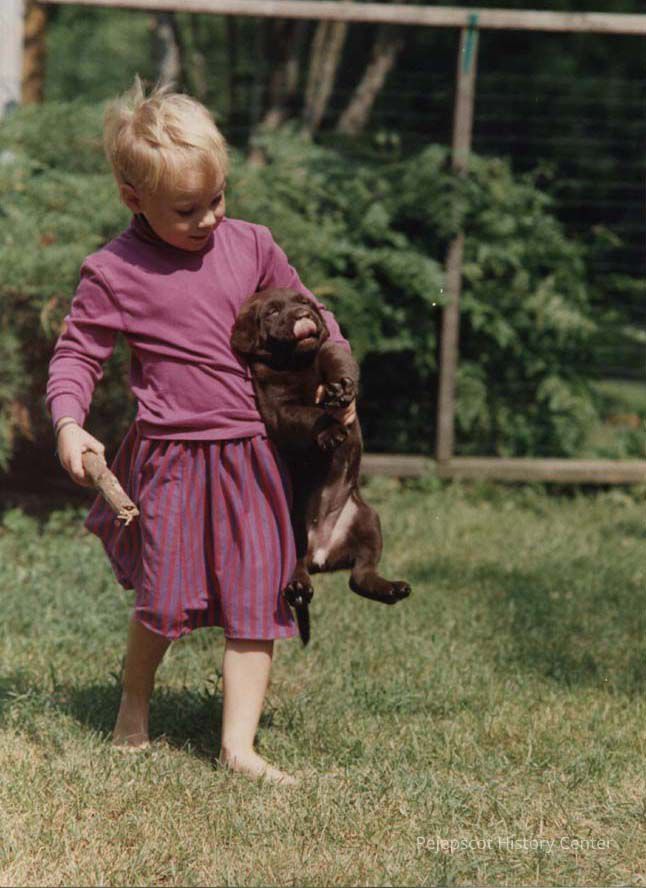 A photo view of a small boy carrying a puppy. 7/21/1989.
