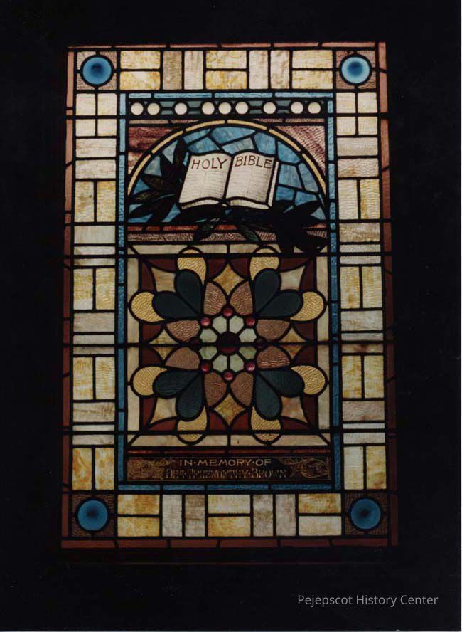 A color photographic view of a stained glass window in the Berean Baptist Church in Brunswick.. This photo was published 6/9/1989.