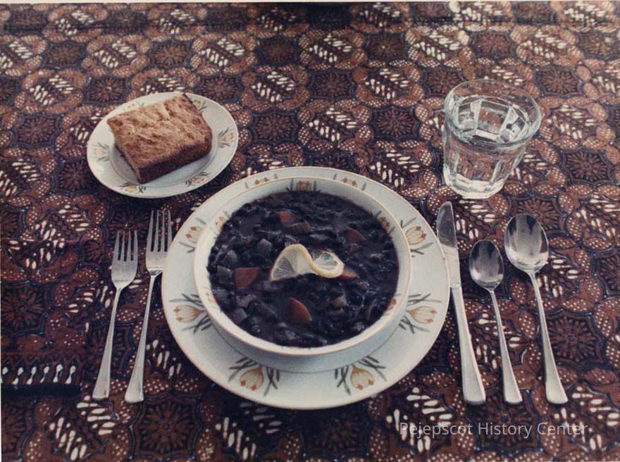 A color photographic view of a table setting of food. This photo was published 4/10/1989.