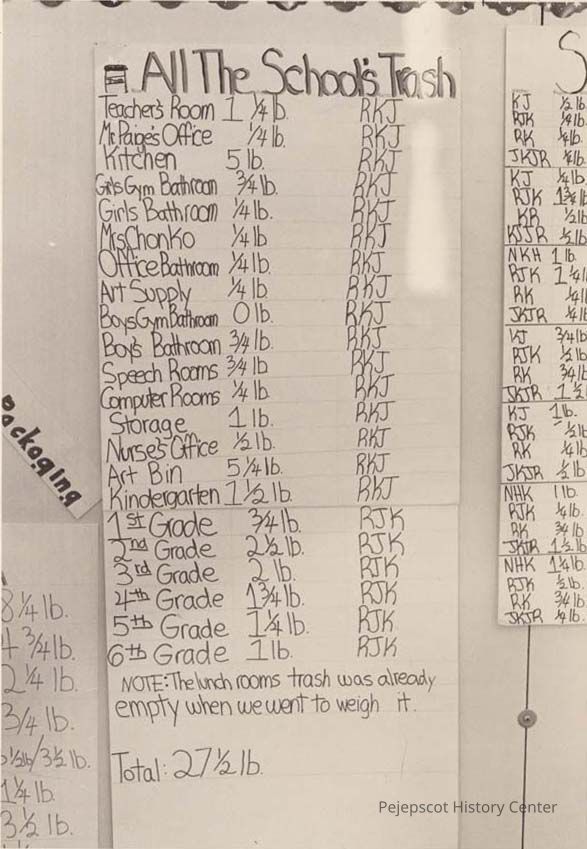 A B/W photographic view of a trash poster. The poster shows the amount of trash generated by each class and room at the school. This photo was published 11/19/1992.