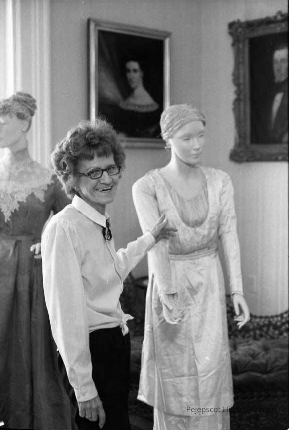 A photo view of a woman and a manakin at PHS Museum.Entry/Object ID
