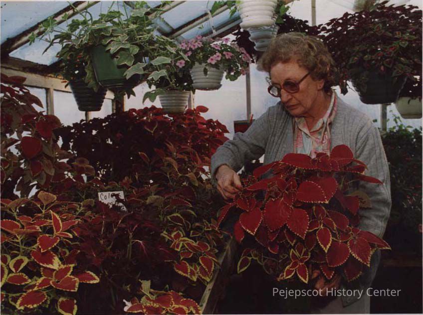 A photo view of a woman looking at plants in a greenhouse. 1/12/1988