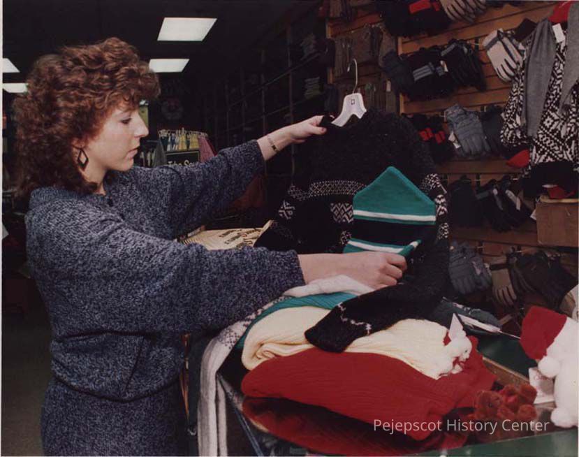 A photo view of a woman looking at sweaters. 12/2/1987.