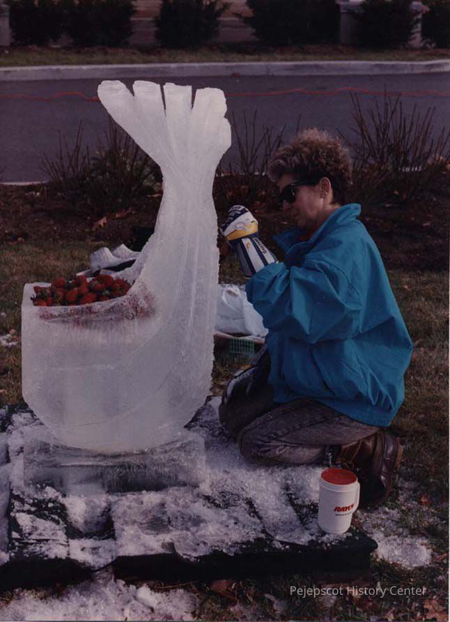 A photo view of a woman making an ice sculpture. 12/3/1990.