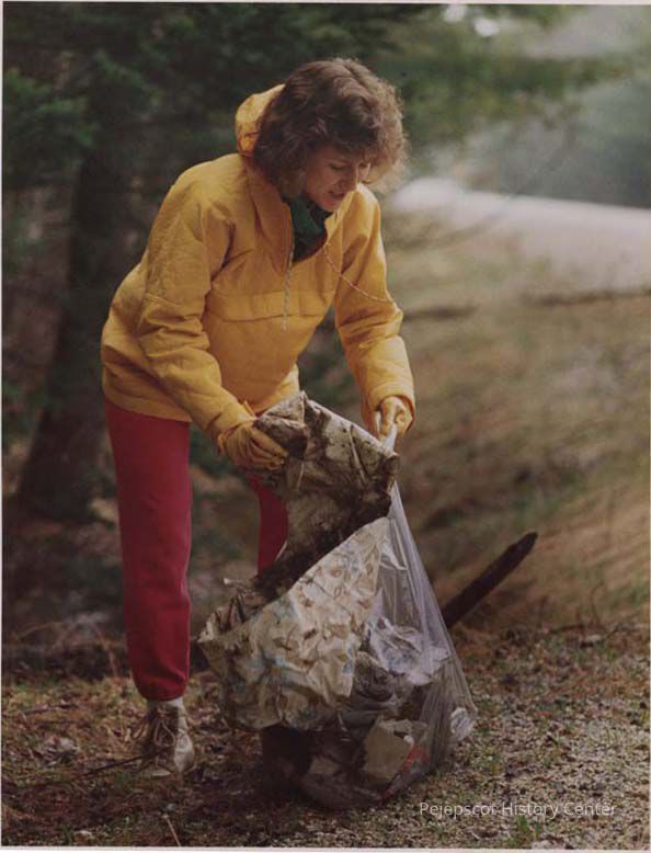 A color photographic view of a woman picking up trash. This photo was published 5/3/1988.