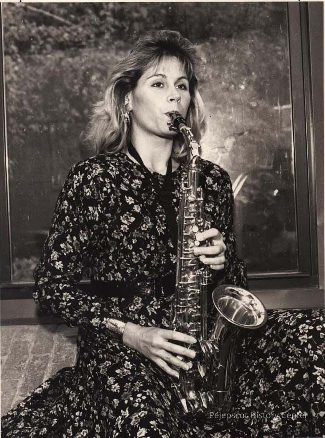 A photo view of a woman playing a saxaphone. 10/4/1992.