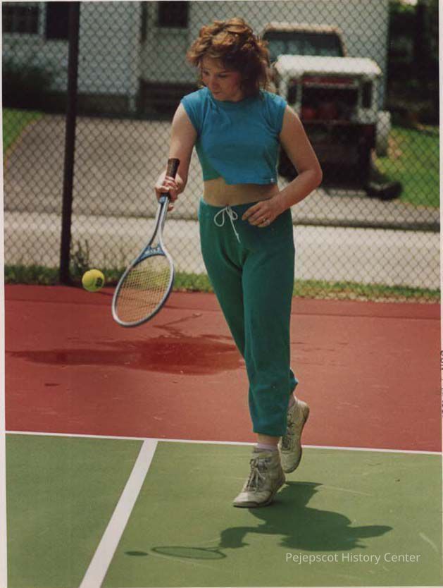 A color photographic view of a woman playing tennis. This photo was published 6/11/1987.