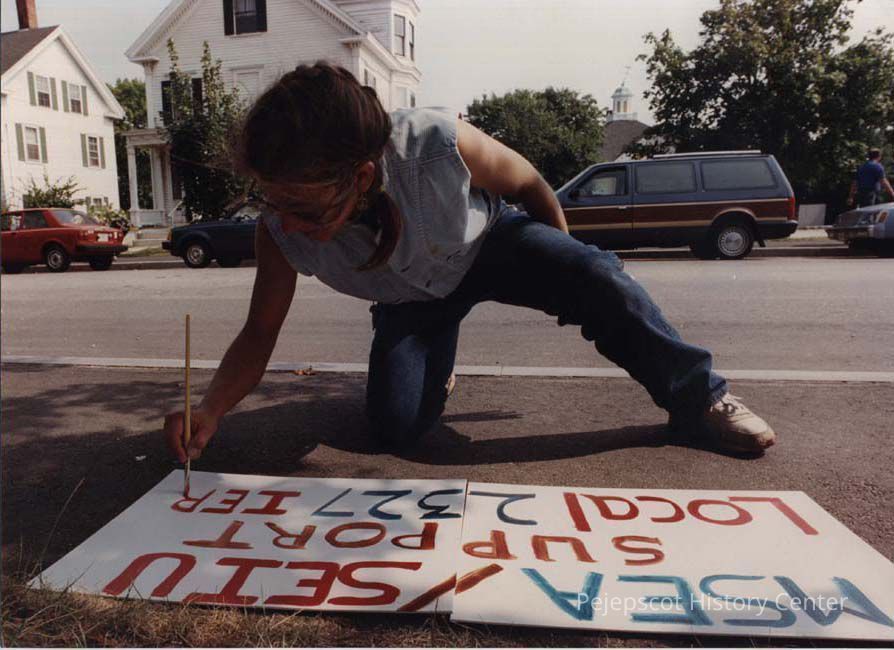 A color photographic view of a woman preparing a strike sign. MSEA = Maine State Employees Association. This photo was published 9/8/1989.