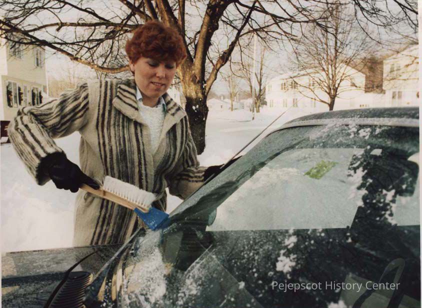 A photo view of a woman scraping ice off her windshield. 1/7/1987.