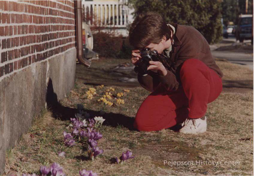 A photo view of a woman taking pictures of some flowers. 3/22/1988.