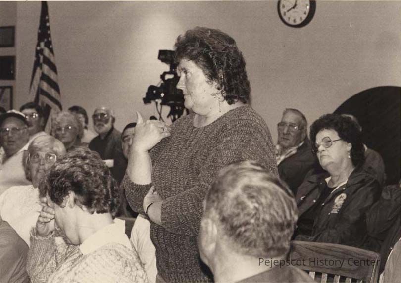 A B/W photographic view of a woman talking to a crowd. This photo was published 9/23/1992.