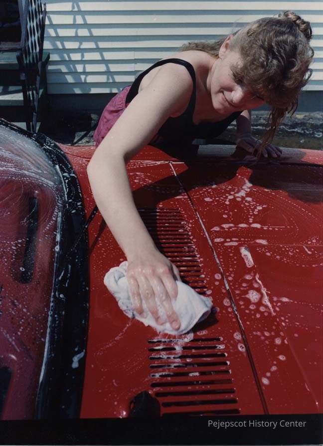 A photo view of a woman washing a car. 5/18/1989.