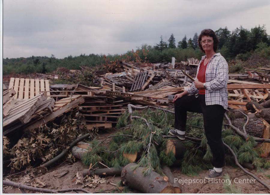 A color photographic view of a woman with a clip board near a pile of wood.. This photo was published 9/13/1989.