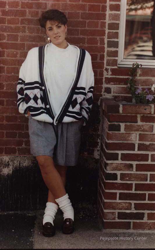 A color photographic view of a woman leaning against a brick wall. This photo was published 8/28/1989.