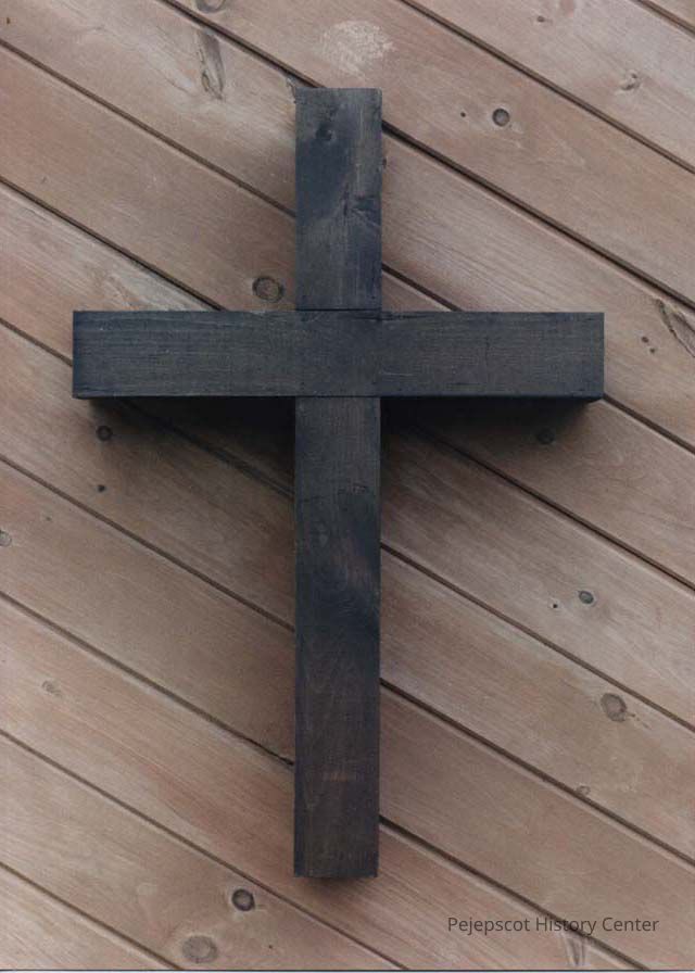 A color photographic view of a wooden cross on a wall. This photo was published 8/4/1989.