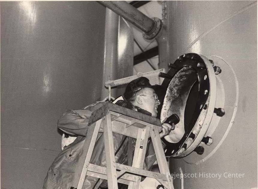 A B/W photographic view of a workman checking the inside of a tank. Marked on the front, "Me elec." This photo was published 8/15/1992.