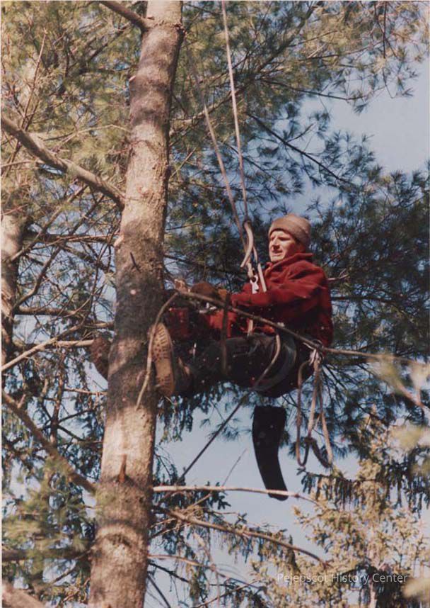 A photo view of a workman in a tree. 2/25/1987.