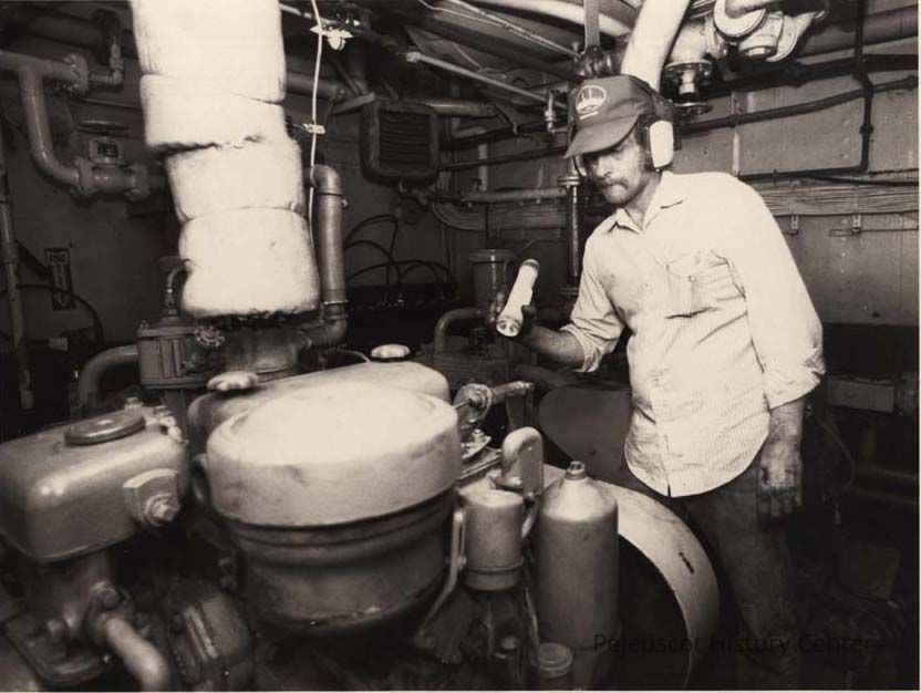 A B/W photographic view of a workman on board a ship. 5/29/1992. This photo was published 5/29/1992.