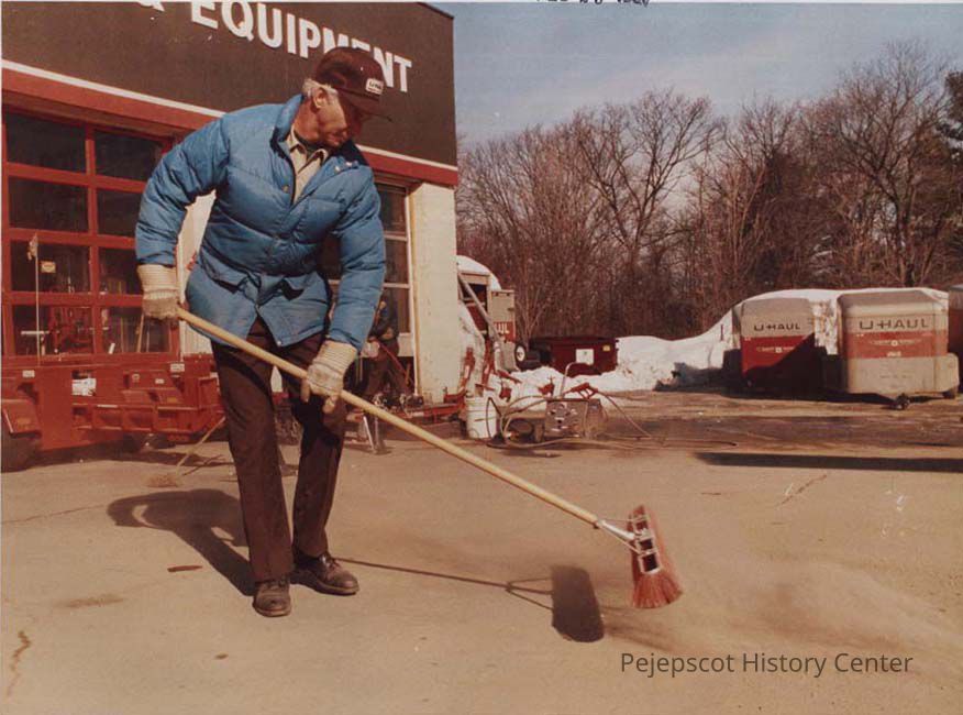 A color photographic view of a workman sweeping outside the Uhaul Store. This photo was published 2/25/1987.