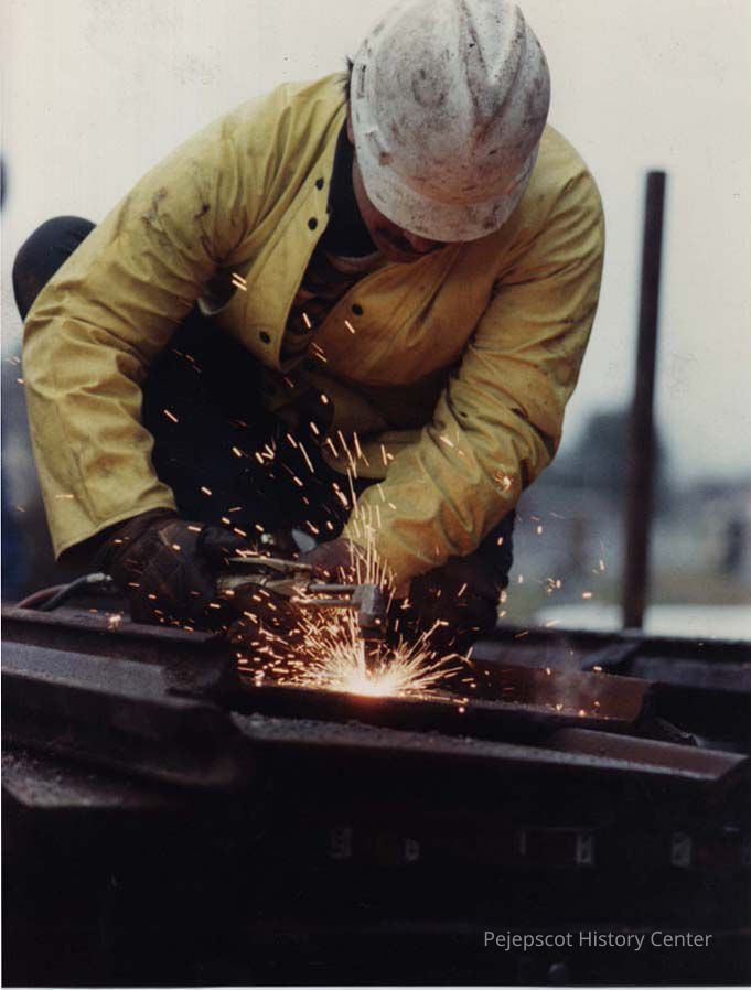 A photo view of a workman welding. 11/21/1989.