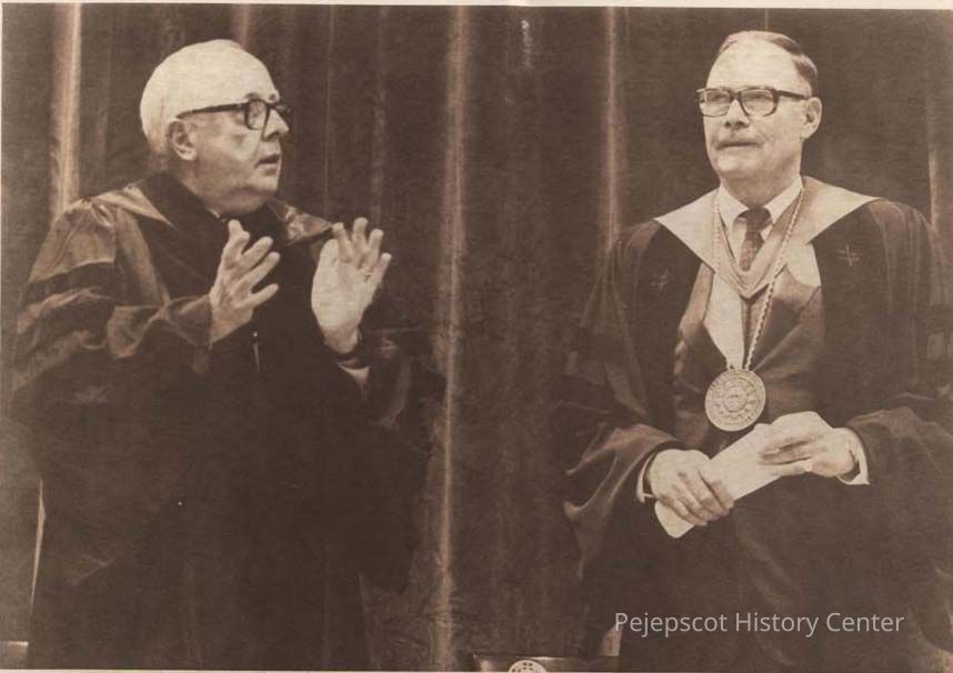 A B/W photographic view of A. LeRoy Greason, (on the right) president of Bowdoin College.