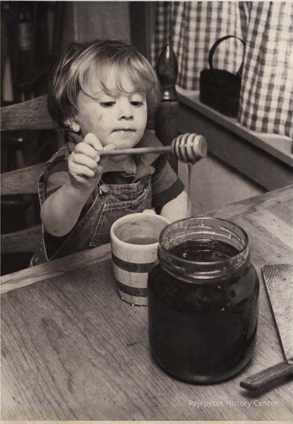 A photo view of Adam Clayman putting honey in his tea. 9/14/1981.