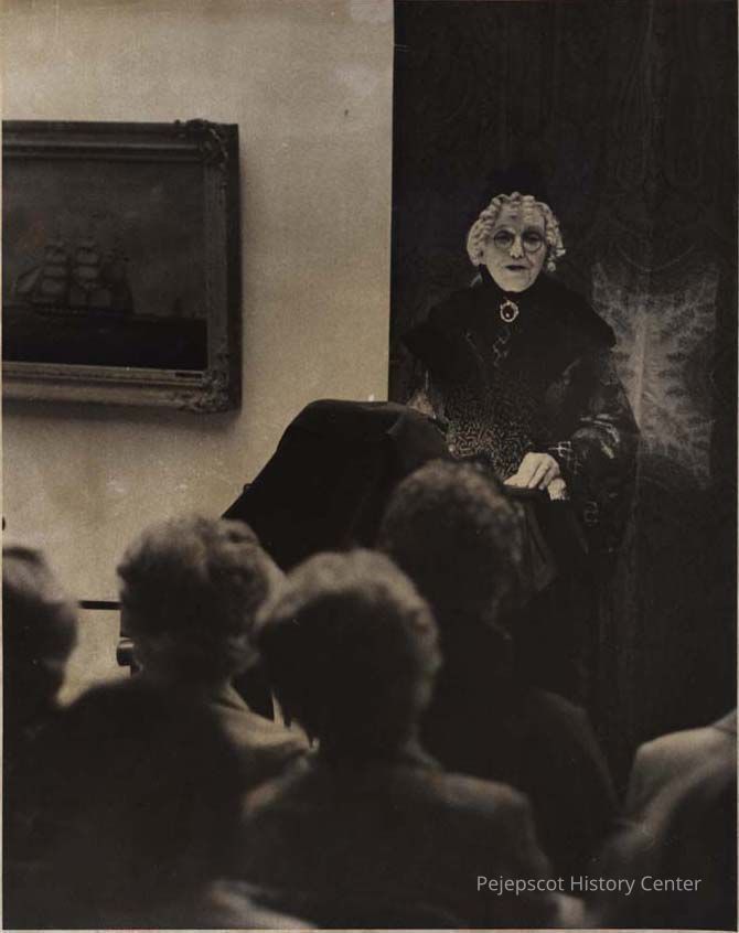 A B/W photographic view of Alice Manseur Packard dressed as Lavina Pennell a neighbor of Henry Wadsworth Longfellow.. This photo was published 5/3/1976.