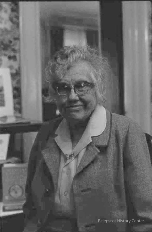 A B/W photographic view of Alice Whittier. Late 1978. She appears to be in the Pejepscot Historical Society building on Lincoln Street.