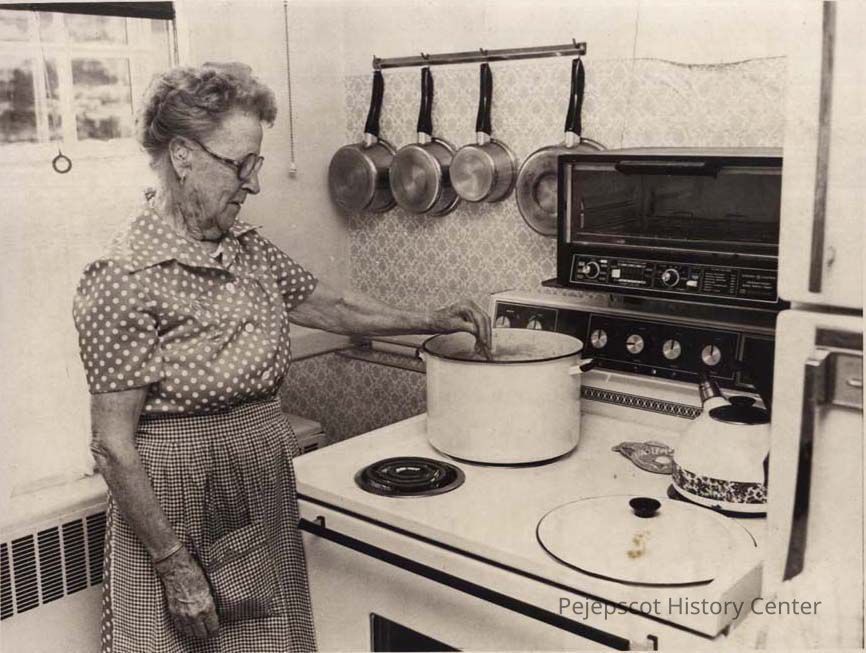 A B/W photographic view of Amelia Skolfield making pickles. This photo was published 9/8/1981.