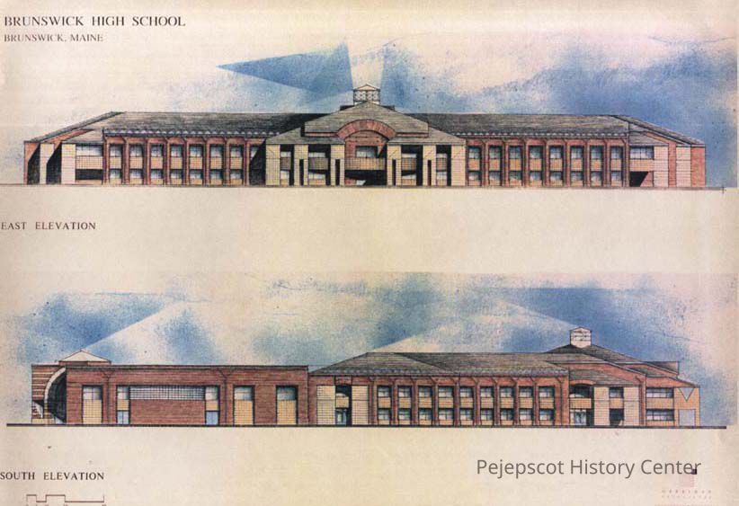 A color photographic view of an architectural drawing of the new Brunswick High School.