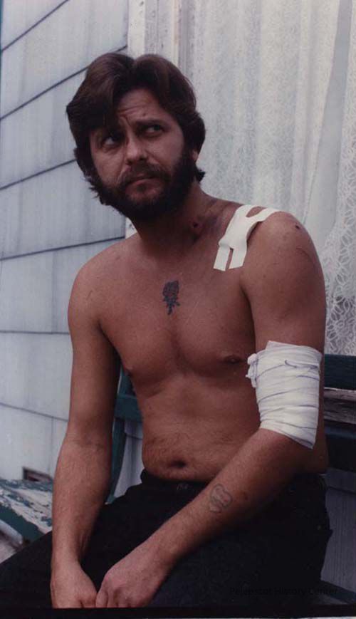 A color photographic view of an injured man, John Touchton. This photo was published 10/09/1990.