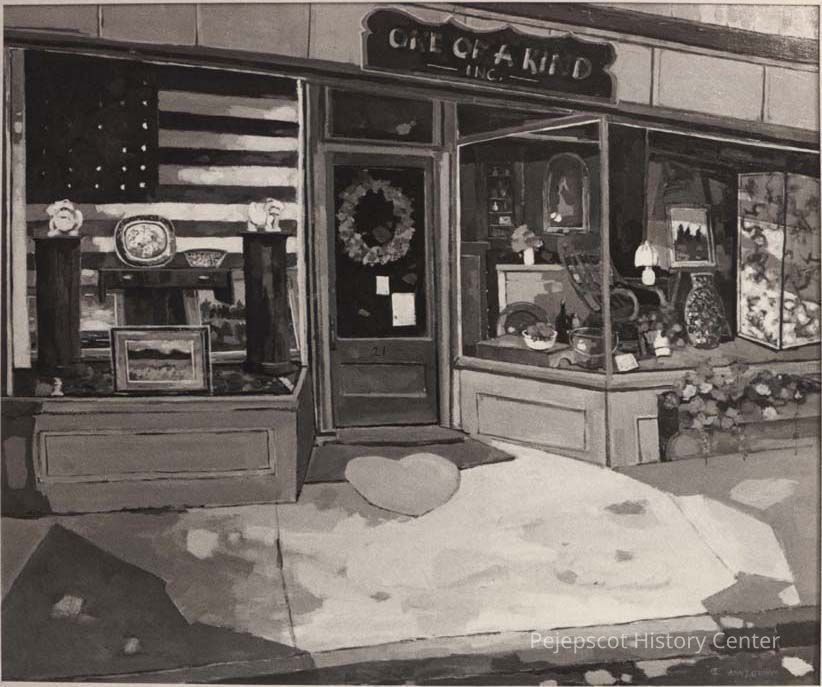A B/W photographic view of an oil painting of a store front. The painting is titled, "One of a Kind". This photo was published 9/24/1992.