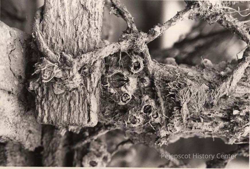 A B/W photographic view of a weathered, aged and barnacles clinging to an old discarded lobster trap.