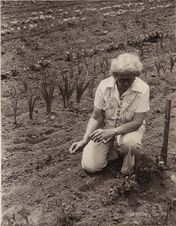 A B/W photographic view of an unknown woman working in a flower garden. This photo was published 6/24/1976.
